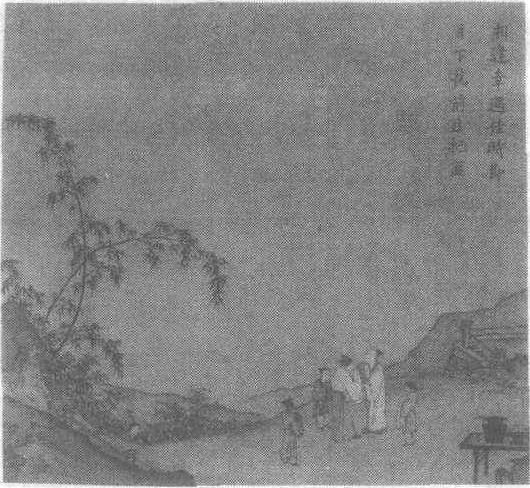 | 释义 | 宋人月下把杯图页宋。绘者不详。绢本设色。纵25.3厘米,横27.5厘米。天津市艺术博物馆藏。此图描绘的是月夜下旧友会聚于山间的情形。图中远景阔远凝净,空中一轮明月高悬,月光洒满山间。图中近景的左侧是山麓缓坡,其上翠竹丛生,竿曲叶垂,给月夜增添了几分秀媚;近景右侧摆放几案,案上置酒炉,前边不远处有一柱栏围起的平台;近景中间绘两位惜别的旧友,在这姣好的月夜美景中会聚,相对而立,举杯恭贺,三稚童在旁边侍立;山坡下又一稚童正负琴拾级而上。此图风格近似马远,物象多沿画面底边安排,以突出月夜下天空的明净开阔,整幅画面充满了一种清新、惬意的氛围。此图右上方有楷书题诗:“相逢幸遇佳时节,月下花前且把杯。”