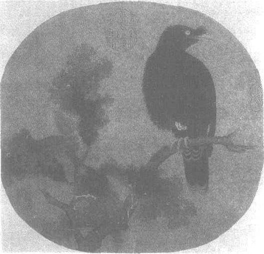| 释义 | 宋人枯树鸲鹆图页南宋。无款。绢本设色。纵25厘米,横26.5厘米。北京故宫博物院藏。此图是一幅工笔重彩的花鸟小品。画面上,一段老树的残枝孤零零地挺立在秋风之中,几片宽大的树叶摇曳拂摆,叶缘曲卷枯黄、残碎斑驳。一只羽色乌黑的鸲鹆(俗称“八哥”)栖立于残枝之上,侧头凝视远方,呈现出一副警醒不安的神态,也更增添了画面中的瑟瑟秋意。此图布局严谨,笔法工致精细,神形兼备,枯叶在秋日昏暮间映现出来的光泽描绘得尤为出色。幅中钤有<桂坡安国鉴赏>、<大观>半印和<宣统御览之宝>收藏印三方。