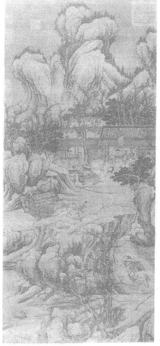 | 释义 | 宋人盘车图轴南宋。佚名。绢本设色。纵109厘米,横49.5厘米。北京故宫博物院藏。此图表现深山幽谷间货运车辆艰难行进的情景。峰岭嵯峨,乱石磊叠,山谷幽暗迷转。丛密的寒林散布在峰岗坡角,有些已经枯落凋零,而另一些则显得郁郁苍苍。一条不很宽的山路在一家小客栈的门前折转而下,一辆多牛牵挽的双轮货车和一辆人畜共驾的独轮小车分别从各自不同的方向朝客栈驶来。独轮车位处下方,黄牛奋蹄牵拉,车夫前拽后抵,尤见行路之难。客栈门前栓着四匹骆驼,有的正在槽中吃草,有的卧在一旁安歇。店幌之下停着一架粮车。屋中有人伏案打盹,小伙计忙着端饭、上茶招待刚来的客人。此图笔法灵活,皴染细腻,情节表现真切生动。本幅及裱边上有清人梁清标及乾隆内府收藏印多方。《石渠宝笈初编》著录。