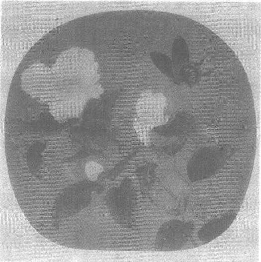 | 释义 | 宋人茶花蝴蝶图页南宋。无款。绢本设色。纵22.1厘米,横23厘米。上海博物馆藏。图中一茎茶枝斜生于画面中部,枝条细嫩,绿叶宽肥,几朵洁白的茶花或含苞待放,或绽蕊盛开,花瓣娇柔,在柔润舒卷的绿叶丛中显得格外雅致、高贵。图右上角,一只色彩斑斓的蝴蝶循着花香飘飘而下。茶花婆娑的姿影与蝴蝶曼妙的舞态融为一体,产生出一种有诗有情、有意有景的画韵。此图笔调工致,设色雅秀,并通过浓淡变化渲晕出花、叶、蝶翅的不同质感。构图生动,宛然如真,风格近似林椿,应是南宋画院高手所作。