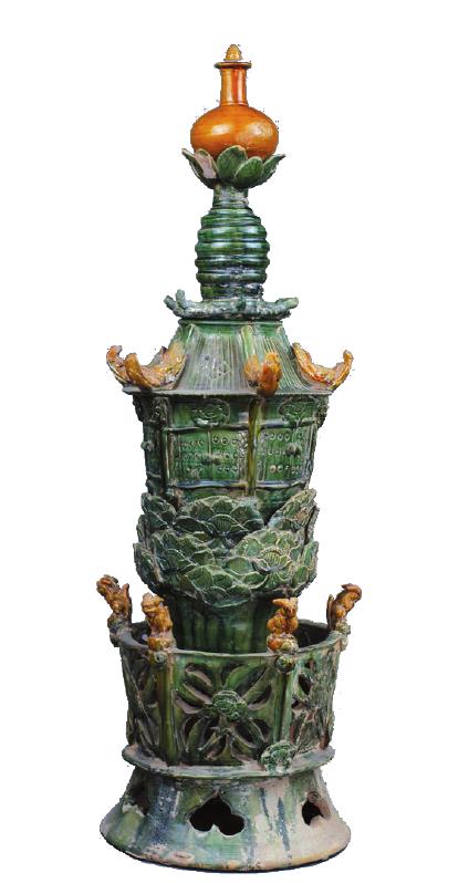 | 释义 | 宋代琉璃舍利塔陶器。国家一级文物。1979年出土。为红陶质,通高 79 厘米,形制为仿木构楼阁式,由底座、塔身和塔顶三部分组成。底座为喇叭形,座身有 6 个桃形镂空孔洞,中部收身束腰,上有六角形镂空仰莲,各角上都有圆形依柱,柱额上各有一个小兽。底座中间为塔柱,柱外为平座,柱上为多层莲花瓣,以仰莲直接承托较高的塔身。塔身为仿木构楼阁式建筑,四周雕刻门宙、柱额、屋檐以及天神等,攒尖顶上有戗脊飞檐出挑,脊端装戗兽。塔顶上设有十三层相轮,再上为仰莲,上置黄色宝瓶。通体施翠绿色铅釉。为瘗藏当年寿山寺高僧舍利之物。宝瓶、戗脊、神兽为黄色,与塔座、塔身及宝刹翠绿色相映衬,显得釉彩鲜艳、协调、晶莹、舒目。而且塔身造型显得秀丽、匀称,为宋代三彩的成功之作。现藏天水市博物馆。