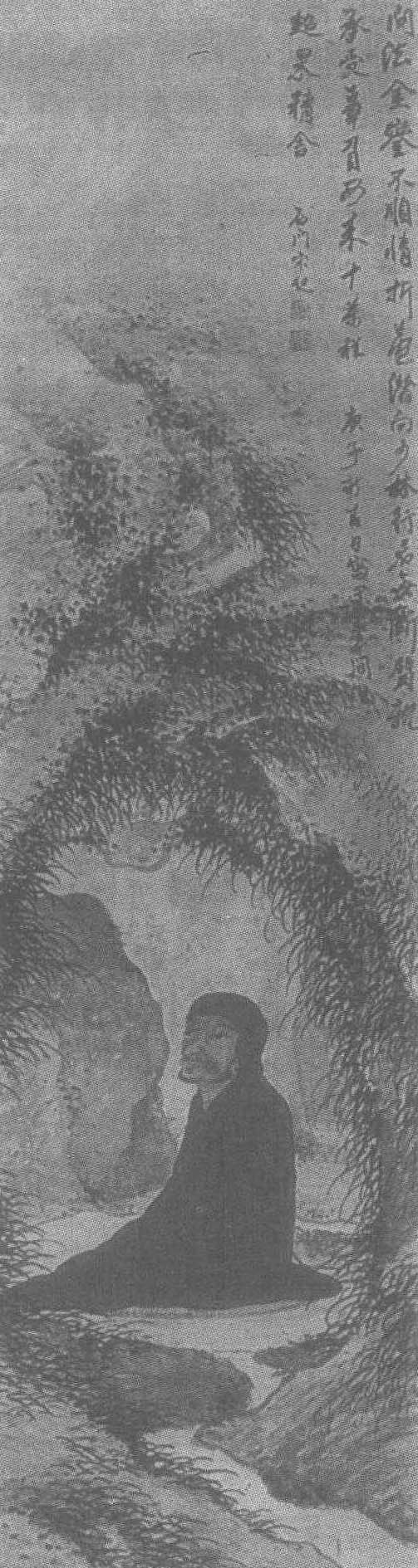 | 释义 | 宋旭达摩面壁图轴明。宋旭绘。纸本设色。纵121.3厘米,横32.2厘米。辽宁省旅顺博物馆藏。宋旭见《宋旭万山秋色图轴》条目。达摩是中国佛教禅宗的始祖。据南朝梁释慧皎《高僧传》记载,达摩是天竺(今印度)人,本名菩提多罗,梁普通元年(公元520年)到中国,后在嵩山少林寺面壁九年,传法于慧可。此图所作的就是他面壁修炼的情形:岩石兀立,野草丛生,溪水蜿蜒流淌的山涧中,达摩身着连帽红色袈裟,面壁坐于蒲团上凝神默想,宁静的目光、紧闭的双唇、棱角分明的下颏,无不表现达摩坚韧不拨,虔诚沉稳的性格。画的右上角有作者题诗一首,署款“庚子新春日写于云间超泉精舍,石门宋旭”,钤白文印两方。宋旭生活于明嘉靖、万历之间,既经历过嘉靖庚子(公元1540年),也在万历庚子(公元1600年)生活过。有学者根据此图用笔特征,判断署款中的庚子为万历庚子。