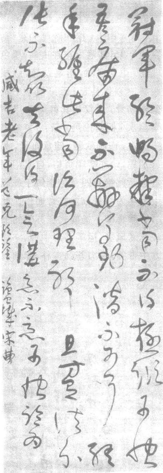 | 释义 | 宋曹草书临张芝帖轴清。纸本。纵234厘米,横79.5厘米。江苏省南京博物院藏。宋曹(见《宋曹草书临王羲之蜀都帖轴》条目)书。此轴是临张芝帖:“冠军暂畅释当不得极踪可恨吾病来不辨行动潜不可耳终年缠此当治何理耶且方有诸分张不知此去复得一会讲竟不竟可恨。”下款署:“临为咸吉老年道史政鉴,盐城宋曹。”草书用笔洗练,苍拙古朴,线条刚柔,布局连续不断,险仄中有平稳,变化里求统一,其雄宕奇逸,咄咄逼人,气势磅礴。