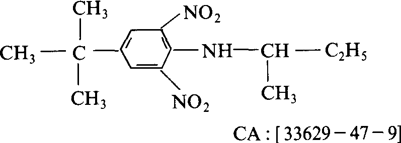 | 释义 | 丁乐灵butralin选择性苗前二硝基苯胺类除草剂,亦可用作烟草腋芽抑制剂。又名双丁乐灵、地乐胺、Amex、A-820、Linamex、Tamex。化学结构式: