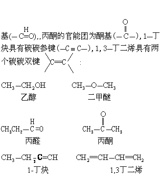 具有相同分子式,分子中的官能团不同而产生的异构体称为官能团异构,属构造异构的一种。例如,乙醇和二甲醚、丙醛和丙酮、1-丁炔和1,3-丁二烯等,每对异构体中的官能团都不相同。乙醇的官能团为羟基 (—OH,二甲醚具有醚键 (C—O—C)。丙醛具有醛