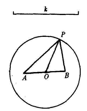与两定点距离的平方和等于定长线段的平方的点的轨迹.如图,A,B是两定点,动点P满足PA2+PB2=k2,其中k为定长线段.设AB=a.则P点的轨迹是以线段AB的中点O为圆