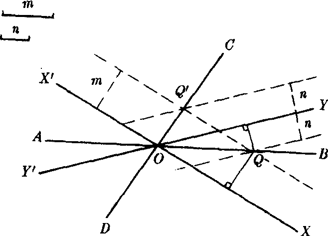 | 释义 | 定比双交线dingbi shuangjiaoxian与两条相交直线的距离之比等于两条不等的已知线段之比的点的轨迹.定比双交线是两条相交直线.如图,两条定直线XX′,YY′相交于O,动点P和XX′,YY′距离之比等于定比m:n,则动点P的轨迹是两直线AB和CD.AB过O和Q,CD过O和Q′.Q和Q′是距XX′等于m,距YY′等于n的两点.上述的直线AB和CD叫做定比双交线.