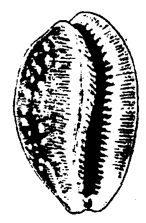 图144 宝贝 宝贝无脊椎动物,软体动物门,腹足纲,宝贝科。贝壳卵圆形或椭圆形,壳面光滑并有各种美丽花纹或斑点。幼体有螺层,成长后螺层被包在里面,外表无螺层,整个贝壳为体螺层所占有。壳口窄长,两唇缘有齿,成体无厣。背壳的背面隆起,腹面平坦,在活动时,头部和外套膜从壳口伸出,并向两侧上翻,覆盖贝壳,日久,致使贝壳变得异常光亮。我国约有40余种,主要分布在广东、福建、台湾沿海,以海南省和东沙群岛、西沙群岛等沿海种类较多。古代曾用它作为货币,我国直至秦、汉时才废除。肉可食用,贝壳多作为装饰品、干制标本或玩赏。
