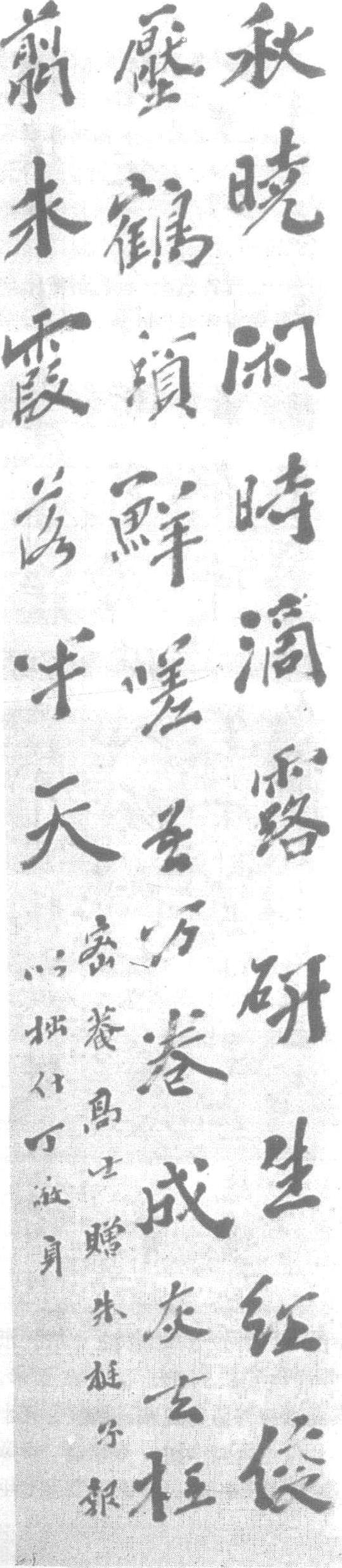| 释义 | 丁敬行书秋晓闲诗轴清。纸本。纵133.7厘米,横28.7厘米。北京故宫博物院藏。丁敬(清康熙三十四—清乾隆三十年,即公元1695—1765年)字敬身,号龙泓山人、钝丁、砚林。钱塘(今杭州)人。乾隆初举鸿博不就。工诗善画。好金石文字,分隶皆入古法,尤擅篆书。所制印章别具风格,为“浙派”—“西泠八家”之首。此件作品书七绝诗一首:“秋晓闲时滴露研,生红俊压鹤头鲜,嗟吾万卷成灰去,枉翦朱霞落半天。”用笔参以隶意,笔势拓展开放,书风苍健质朴。有多处渴笔。“浙派”,有中国画流派、篆刻流派、清诗流派之别。此为篆刻流派,丁敬开创。继者有蒋、黄、奚、陈、赵、钱等人,因都是杭州人故又称“西泠八家”。