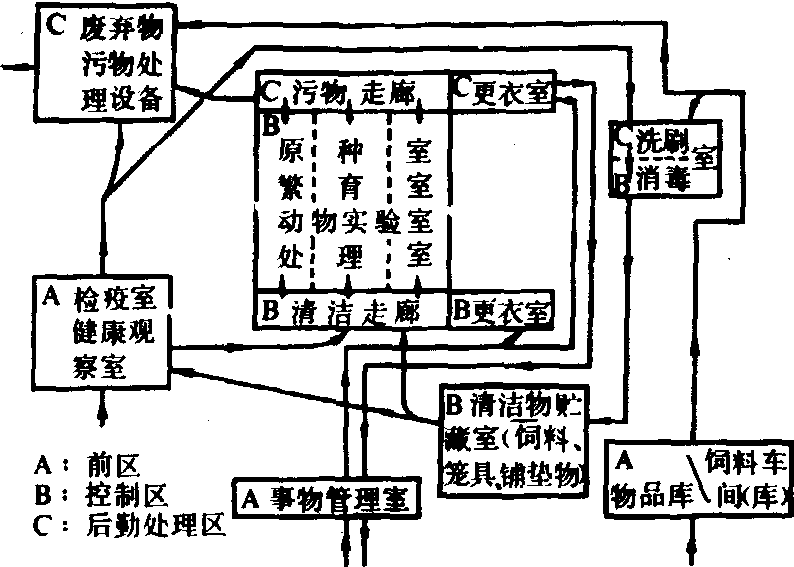 ❷控制区,包括原种室、育种室、繁育室、饲养待发室、各种动物实验室、清洁走廊及清洁物贮藏室;