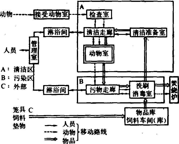 组成 一般由饲养室、隔离检疫室和健康观察室、各种实验室和处理室(外科手术、实验处理、解剖、术后管理、疾病诊断、治疗、生理生化检查、微生物检疫、饲料营养分析、特殊饲料的调制和剖腹产等)、贮藏室、清洁准备室、洗涮消毒室、工作人员用房(包括办公室、休息室、淋浴室、更衣室、厕所等)、走廊(清洁和污物走廊)、废弃物处理设施、机房和变电所等组成。