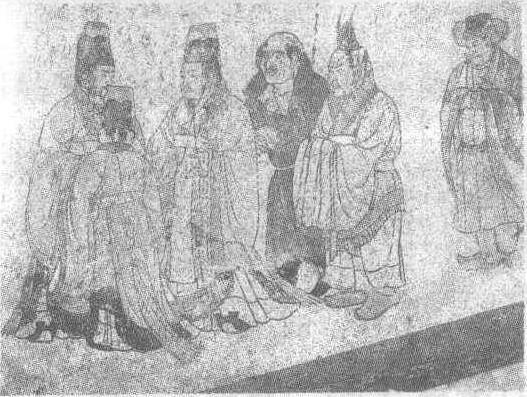 | 释义 | 客使图壁画唐景云二年(公元711年)。纵184厘米,横342厘米。陕西省乾县乾陵陪葬墓章怀太子墓墓道东壁壁画。1971年发掘。图中绘六人,表现的是在唐文职官员的引导下,外族使节准备参谒的场面。左侧三人为大唐文官,头戴笼冠,穿黄色长袍,束腰带,着翘头靴,面带一种符合身份的持重和严肃,三人围成一圈,正在议事。画面的右侧是三位等待参谒的使者,其中一位头戴羽冠,身着红缘白袍,双手相拱,推测可能是高丽使者;其身旁一位卷发,谢顶、高鼻、深目,着翻领衣,穿黑靴,可能是来自西域或欧洲的使者;最后一位头戴皮帽,披灰氅,穿皮裤,显然来自寒冷地带。三人的表情庄重,从其站姿和神态可看出他们对唐王朝的敬慕。此图人物外貌特征鲜明,精神气质颇佳。绘画时多用原色,间以重彩和淡彩相结合,鲜丽而明快,是唐代中外文化交流的真实写照。
