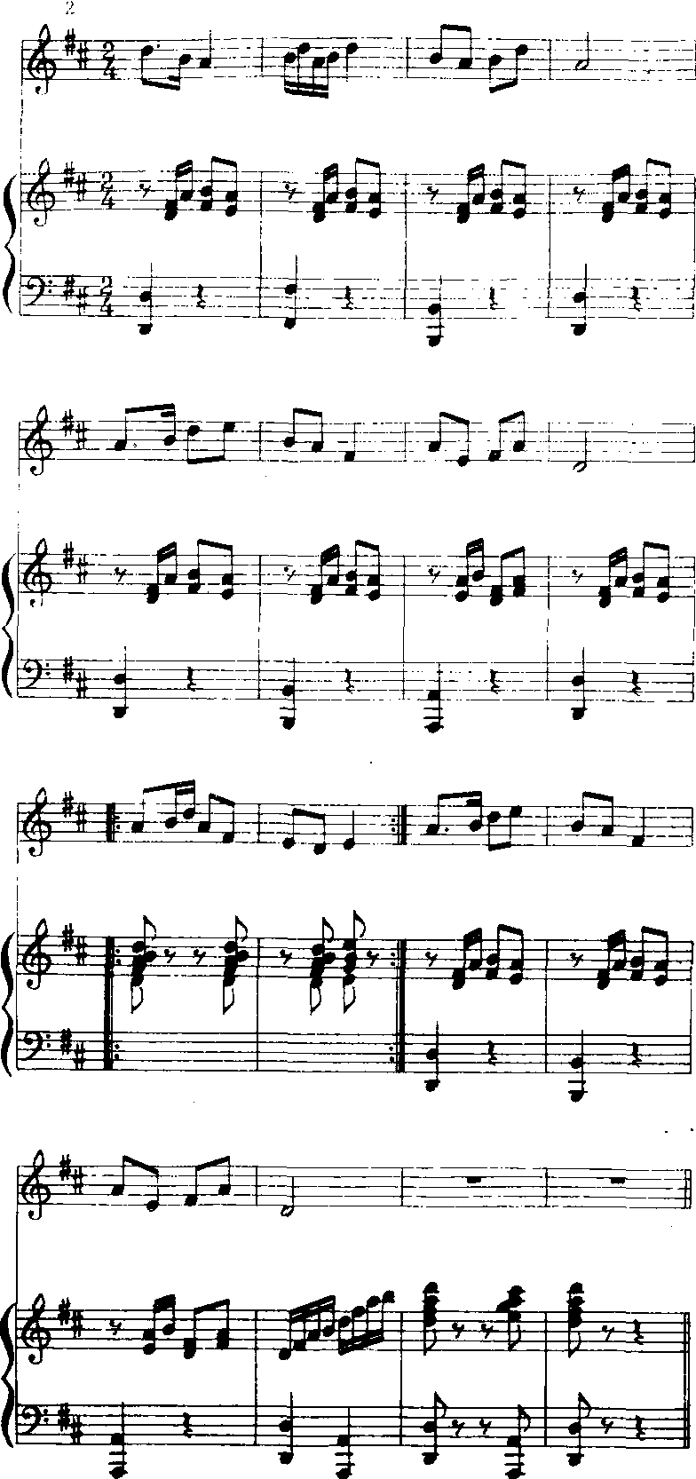 | 释义 | 宫调式歌曲和声配置Gongdiaoshi gequ heshengpeizhi在五个民族调式中,宫调式是最重要的一个调式,宫调式的主音是宫(do),上、下五度的骨干音是徵(sol)和清角(fa),由于清角是偏音,因此常用角音(mi)来代替。宫调式的和声以宫、角、徵三个音构成主和弦,这和大调式的主和弦是一样的,为了减弱这个和弦的大调式的功能感,常在宫调式的主和弦上加一个Ⅵ级音(La),形成附加六度音和弦。宫调式的属和弦中有偏音变宫(si),偏音在中间三音的位置,可用省略法省去三音,也可用代用法用do代替原来的三音si,还可用Ⅲ级音上的和弦来代替。下属和弦的根音fa是偏音,应尽量避免使用,可以用Ⅱ级音或Ⅵ级音上构成的和弦来代替。宫调式和声配置举例:例1 《二月里来》 片断; 例2 《八月桂花遍地开》 片断。