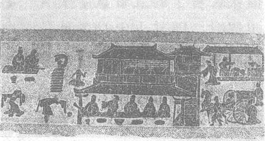 | 释义 | 宴饮杂技画像石东汉。长68厘米,宽237厘米。1973年四川省郫县新胜乡出土。四川省博物馆藏。这是以浮雕及阴线刻法刻于石棺一侧的画像,内容分三部分:左部为杂技乐舞的表演,六个表演者或舒展广袖翩跹起舞,或抚琴吟唱,或倒立于九层案上,或盘坐顶竿弄盘,各具情态。中部为一四阿式顶的双层楼及一杆栏式重檐歇山顶的小楼。楼上层内架许多兵器,下层厅内五人并排而坐,边宴饮边观赏厅外表演。右边上部为内、外均有人忙碌着的厨房,下部为一御者,牵马扶辕,引车而来。此画像石为研究汉代的建筑史、杂技乐舞史提供了形象资料。