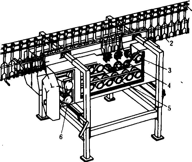图2 指盘式家禽打毛机 1.导轨和链环; 2.吊钩; 3.驱动转盘; 4.橡胶指; 5.传动带; 6.电机与减速器 被脱羽的家禽可自出禽口排出机外。打毛机在工作时需要用水喷淋,以利脱净。良好的打毛机对于肉用仔鸡的羽毛脱净率可达99%,而对于鸭子则需要在打毛之后,将其浸入加有少量松香的热石蜡中,再取出用水激冷,随之剥掉禽体表面的石蜡,蜡除去鸭体上的小绒毛,剥蜡作业也可用打毛机进行。 清膛机 有开式清膛和闭式清膛二种。开式清膛是利用圆盘刀或尖刀将禽胸切开,而后由人工摘除内脏。闭式清膛如荷兰斯托克公司的清膛机,能自动地将家禽定位,切削肛门,吸出并切除内脏,等等,最后还能从内部将禽体冲洗干净,所有作业都自动进行。肉用仔鸡清膛能力为4 000~6 000只/小时。 除了上述作业机械外,还有内脏(可食部分)加工设备,如砂囊处理机、拔气管去头机、去骨机、切爪机、分割机、计量器和包装机等。屠宰加工厂还备有一套废弃物收集系统,位于屠宰加工设备的下方,由气流将禽头、气管、禽爪、肺、肠等输送并集中于杂物收集箱,以便进一步提取脂肪和动物蛋白。 |