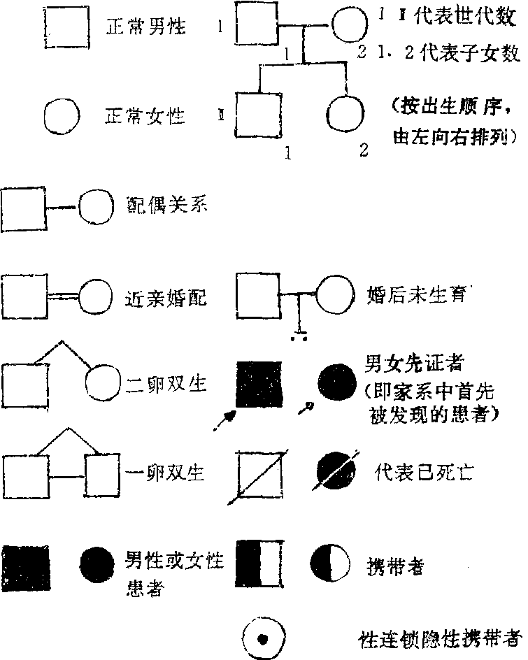 | 释义 | 家系调查jiaxi diaocha当遇到 “先证者”(家族中首先来看病或进行遗传咨询的人)来进行遗传咨询时,通过询问、追访等手段,详细了解先证者及其家族中的发病情况,并绘成系谱图,进行系谱分析,以便确定所患疾病是否为遗传病,以及遗传病的传递方式和下一代患病的风险等等,称为家系调查。调查要详尽,特别要询问婴儿死亡、死产、流产以及有无近亲婚配等情况。绘制系谱图,有一些通用的格式和符号(图1所示) 系谱绘制的格式如图2、3、4所示。