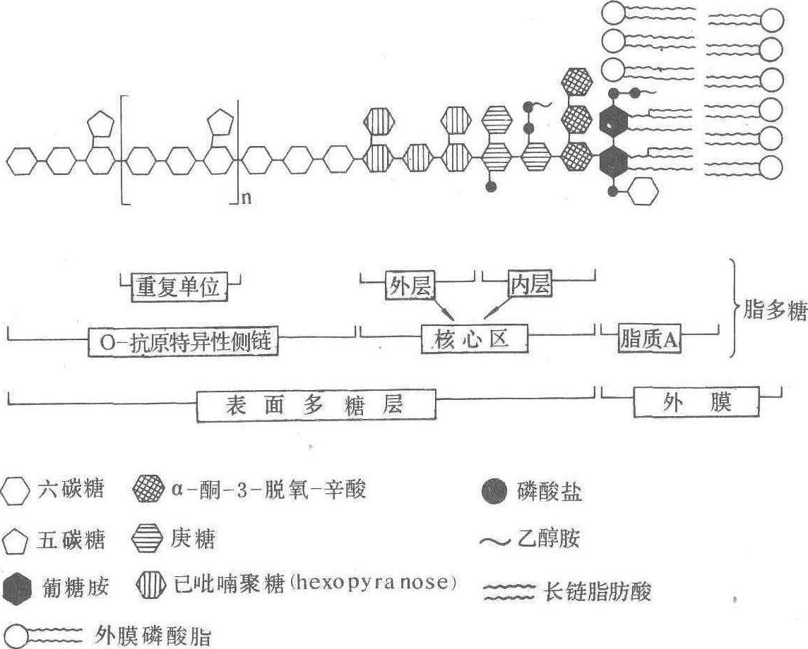图1 革兰氏阴性细菌外膜脂多糖分子结构模式 (引自G.H.LaY等1990)