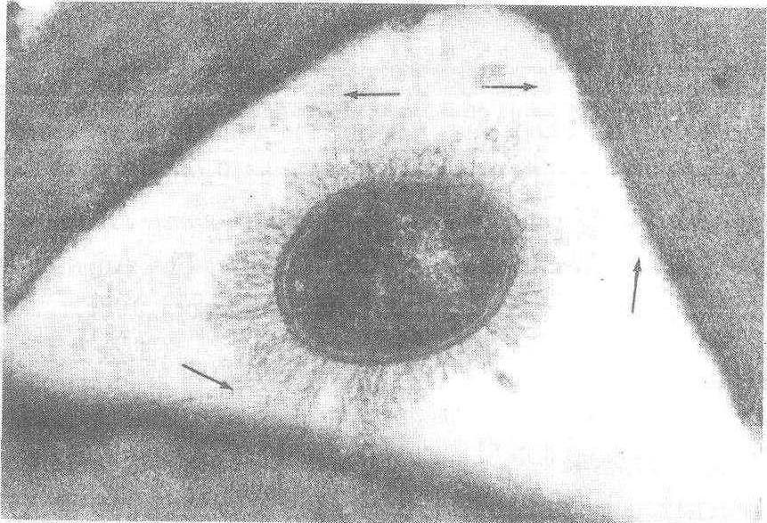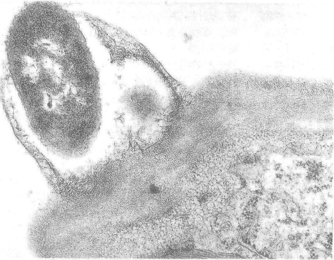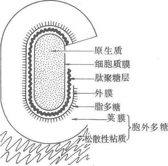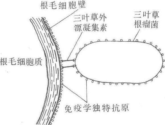 图2 革兰氏阴性细菌表面多糖分布示意图 属于亲和性识别的有豆科植物根瘤菌系统和双子叶植物根癌土壤杆菌系统。在豆科植物根瘤菌系统中植物识别子为外源凝集素,细菌识别子为脂多糖、荚膜多糖和性纤毛,它们分别在细菌对根毛的快速吸附,极性吸附和形成微菌落中起作用。在双子叶植物冠瘿病系统中,植物识别子为果胶化合物,细菌识别子有脂多糖和纤维素微纤丝,分别对细菌在伤口的吸附和菌体集结吸附中起作用(图3)。另外,在病原物毒素引起感病反应的系统中,病原物寄主专化性毒素和感病寄主的相应受体也起识别子的作用。 属于非亲和性识别的有烟草与不亲和病菌豌豆假单胞以及与青枯假单胞不亲和小种的互作。在两个组合中植物识别子分别为植物细菌凝集素和植物外源凝集素,相应的细菌识别子均为脂多糖,两种不亲和细菌注射到烟草叶片中后发生的共同现象是细菌被纤维或颗粒状物质包围和固定(图4)。另外,植物主动抗病性中防卫反应的发生是病菌中起识别子作用的无毒基因产物或次生代谢产物与寄主抗病基因产物——受体的结果(见主动抗病因素)。 识别模式 主要有交叉桥结构模式和激发子—受体模式。 交叉桥结构模式 用来解释寄主—病原物接触识别中表面分子互作。根据根瘤菌系统中细菌识别子脂多糖和植物识别子外源凝集素的互作,1975年美国戴佐(F.B.Dazzo)认为寄主的外源凝集素三叶草凝集素A(trifoliin A)以其内侧的葡萄糖残基联结在根毛细胞壁上,外侧的葡萄糖残基与菌体表面的识别子结合(图5)。