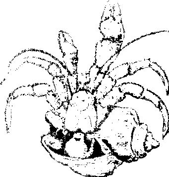 图157 寄居蟹 寄居蟹Jijuxie节肢动物门软甲纲的种类,又称寄居虾,俗称白住房,为潮间带的习见种类。两螯不对称,通常右螯显著大,腹部柔软随螺壳而弯曲,其末端钩于螺层顶部,随身体的长大而不断更换螺壳,以动物尸体为食。 |