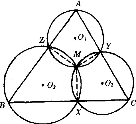 这个定理是密克于1838年叙述并予以证明的.三个圆的公共点M叫做X,Y,Z三点对于△ABC的密克点. 设⊙BZX与⊙CXY交于M点,连结MX,MY,MZ,因为B,X,M,Z四点共圆,C,X,M,Y四点共圆,所以∠AYM=∠CXM=∠BZM,故A,Y,M,Z四点共圆(四边形AYMZ的外角等于其内对角).因此⊙AYZ,⊙BZX,⊙CXY三个圆共点. 当Z于A点重合时,则过A,Y与AB相切的圆当作⊙AYZ.若Y,Z重合于A,则以A点代替⊙AYZ,此时认为点A为“点圆”,其余仿此讨论. |