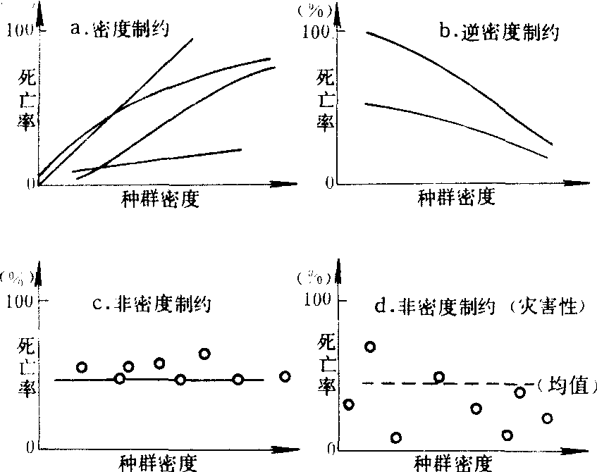 非密度制约因素所引起的种群死亡率比较稳定,且与种群密度大小无关。密度制约因素的制约作用随种群密度增加而加大。逆密度制约因素所引起的种群死亡率,随种群密度增加而减少(图1)。直接密度制约因素(direct density-dependent factors)是对种群数量直接起影响的因素。迟滞密度制约因素(delayed density-dependent factors) 是指在寄主与寄生物的周期变化中,寄生物的增加速度与寄主死亡率并不同步,寄生物总比寄主迟1/4周期。全补偿因素(perfectcompensating factors) 具有最大的稳定效果,可使由其他因素引起的种群数量变动,回复到原来的水平。超补偿因素(overcompensating factors),可使种群回复并超过原有水平。欠补偿因素 ( undercompen-sating factors)是指不可能完全补偿因其他因素干扰而引起的密度变化。
