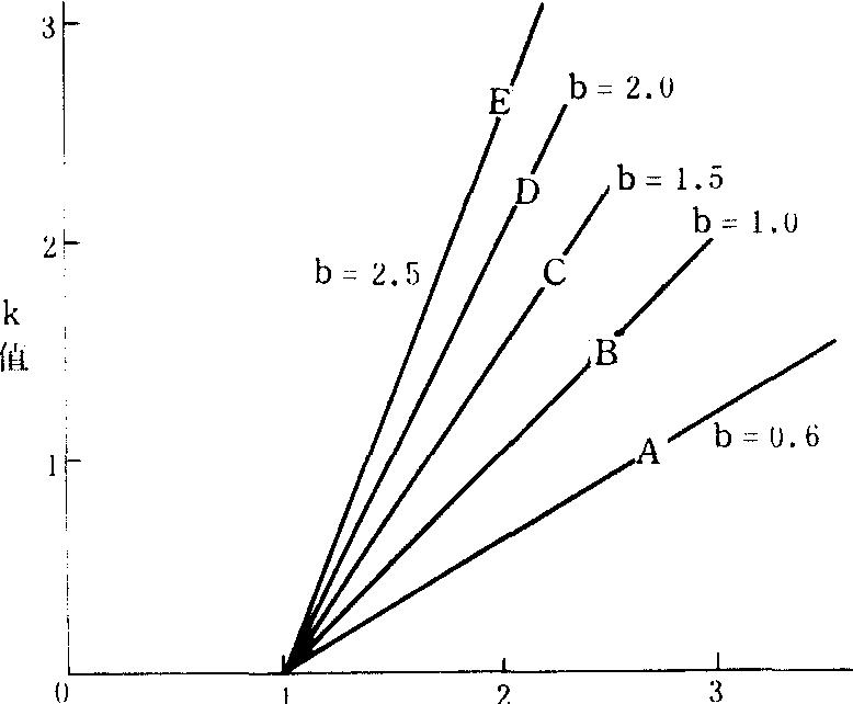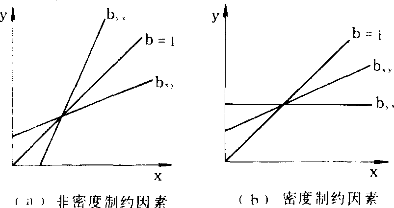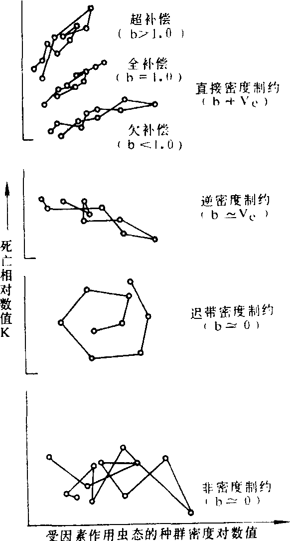 (仿G. C. Varley) 判别 利用回归分析法,结合生命表资料,分析各种死亡因素对种群的影响、与种群密度的关系,以及作用于种群的方式,可判别各种因素的性质。❶检验某种因素是否属密度制约因素,令N1为该因素作用前种群存活数,令N2为该因素作用后种群存活数。经多次调查可获得若干组N1和N2数据,把logN1数据标在x轴上,logN2数据标在y轴上,求logN1对log N2的回归,得回归系数为bxy,然后把xy轴两组数据对调,求logN2对logN1的回归,得系数为byx,在坐标纸上作图(图2),若所得两条直线与b=1的等分线不重合,且在b=1等分线的同一侧(图2b),则可认为对N1→N2起作用的因素为密度制约因素; 若这两条直线各在b=1等分线的一侧(图2a),则不是密度制约因素。 ❷分析这些因素如何起作用。以死亡率对数值(k)与受该因素作用虫态的种群密度对数值作图,求其线性回归系数(b),再根据b值大小估计该因素如何起作用。若b=1,为全密度制约; b<1,为欠补偿因素;b>1,为超补偿因素(图3)。如果将k值与受因素作用虫态的密度对数值作图所得的点,依时间顺序连结起来,不同类型的因素将显示出不同的图形(图4)。直接密度制约因素的图案呈现近直线或狭带形;逆密度制约因素的图形与直接密度制约因素的图形相似,但斜率为负值;迟滞密度制约因素呈反时针的环形或螺形(b≃0);非密度制约呈弯曲无规则形状(b≃0)。