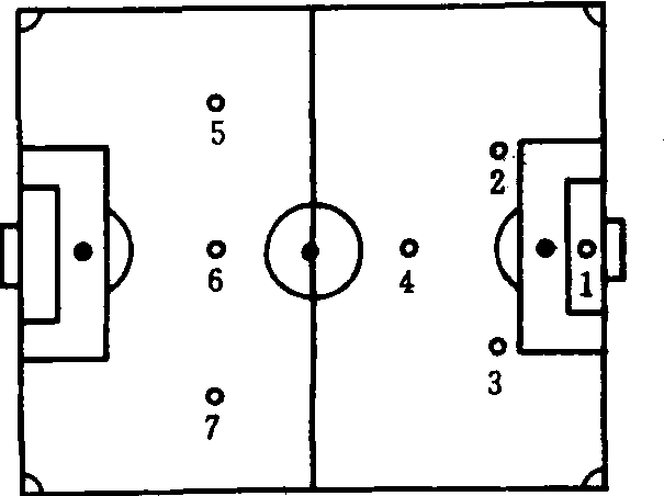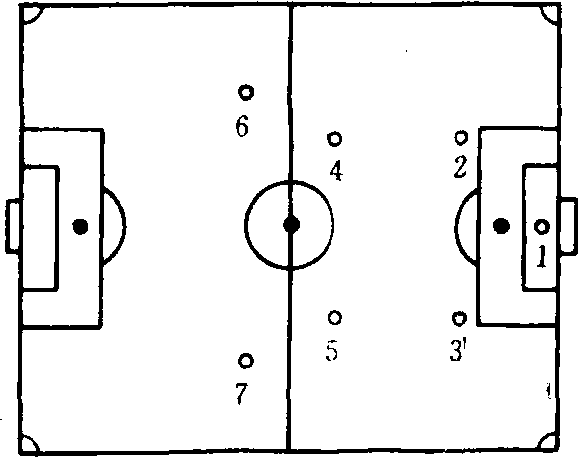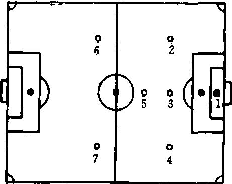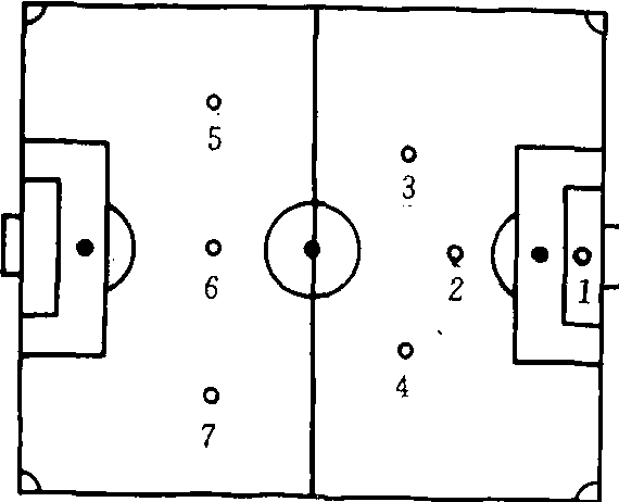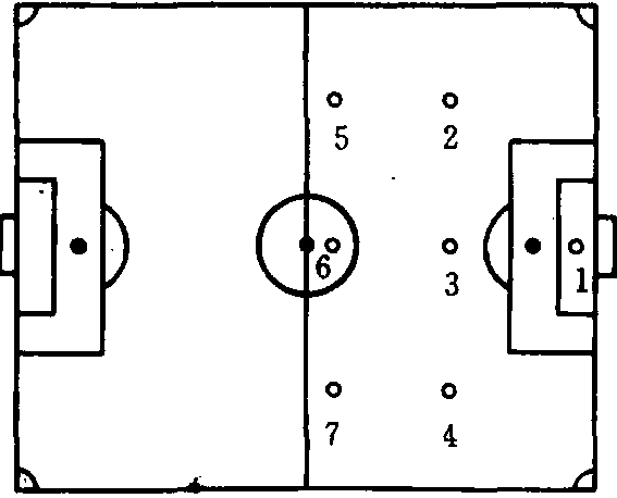 ❺“1—2—3”阵形。这种阵形进攻人数多而防守人数少,攻防不平衡。如遇弱队或比赛中需继续扩大战果, 可采用这种阵形。 |