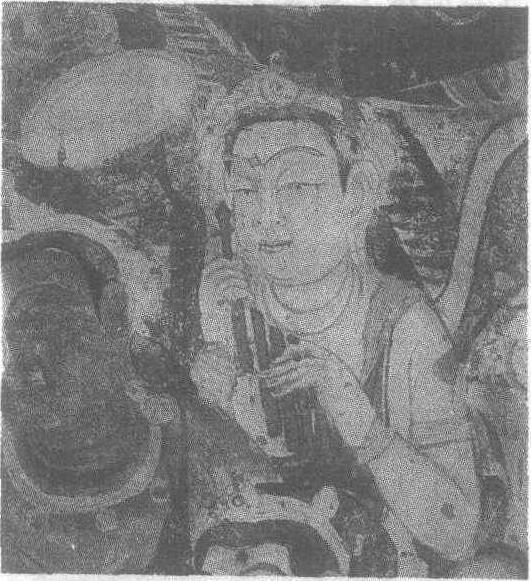 | 释义 | 七佛药师变(乐舞特写)壁画初唐。甘肃省敦煌县莫高窟第220窟北壁壁画。此为乐舞场面中乐队的竖笛手和击拍板者。竖笛手戴黑冠,天衣透体,面型丰圆,眉清目秀,为一俊秀青年。他双手握笛置于唇边,从其神情看所奏曲调平和、舒缓。乐队中另有一位击板者,体态较前者丰腴。手中弄板,神态似在侧耳聆听,显然是辨别主旋律,以便在协奏中适时拍板。两位乐工形象美好,神态生动,人物线条成熟,肌肤的淡色晕染恰到好处,十分自然。