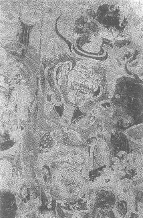 | 释义 | 七佛药师变(蟒神)壁画初唐。纵63厘米,横50厘米。甘肃省敦煌县莫高窟第220窟北壁西侧壁画。图中的西侧描绘了护法的天龙八部,即天、龙、药叉、乾闼婆、阿修罗、迦楼罗、紧那罗、摩睺罗迦。此为摩睺罗迦,它是大蟒神,头戴蟒蛇冠为标志,身体魁梧,眉紧皱,口大张。作者以简练、刚劲而婉转的笔调将它的气贯长虹之势描绘得相当传神。其面部晕染层次丰富,立体感很强。此像堪称初唐时期的壁画精品。