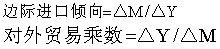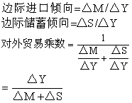 即对外贸易是边际进口倾向的倒数。 发展经济学家哈罗德在说到对外贸易乘数时将储蓄的因素考虑进去,假设出口增加的收入用于消费、储蓄和进口三个部分。在这种情况下,出口增加收入对国民收入的影响大小,取决于 “边际进口倾向” 和 “边际储蓄倾向” 两个因素。“边际储蓄倾向” 是指出口增加的收入(△Y) 中用于增加储蓄(△S) 的比例情况。