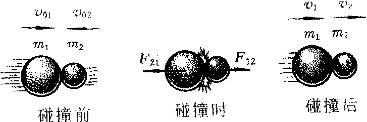 | 释义 | 对心碰撞duixing pengzhuang两物体在碰撞前的相对速度方向沿着两物体中心连线的碰撞。又称正碰。对心碰撞后两物体的速度方向也在其中心连线上,可以用质点模型来处理。以两个孤立的弹性小球发生弹性碰撞为例,所谓碰撞前,是指左图所示的状态,即两个弹性小球刚刚接触,而二者又没有产生形变的状态,这时两球的运动状态都没有改变,仍遵从牛顿第一定律。所谓碰撞后,是指右图所示的状态,即碰撞刚刚结束,二者形变完全恢复而又没有相互脱离的状态,碰撞后它们的运动也遵从牛顿第一定律。从碰撞前到碰撞后所经历的时间叫做碰撞时间。碰撞过程是指中图所示的状态,这一过程虽然很短,但经历二个阶段:从碰撞开始到最大形变的阶段,称为压缩阶段,这个阶段中小球的相对速度逐渐减小到零,小球发生形变,相互作用的弹性力逐渐增加到最大。随后弹性小球的形变逐渐恢复,速度增大,一直到两球脱离接触,这一阶段称为恢复阶段。小球的动量仅仅在碰撞过程中才发生改变,这是由于碰撞期间不断受到变化的弹性力的作用。两物体在碰撞前的相对速度方向不沿两物体中心连线的碰撞,称为非对心碰撞,又叫斜碰。一般处理斜碰的方法是把每一个物体的速度按两球中心连线正交分解为二个分量,其中与中心连线垂直方向不发生碰撞,在中心连线方向发生正碰。