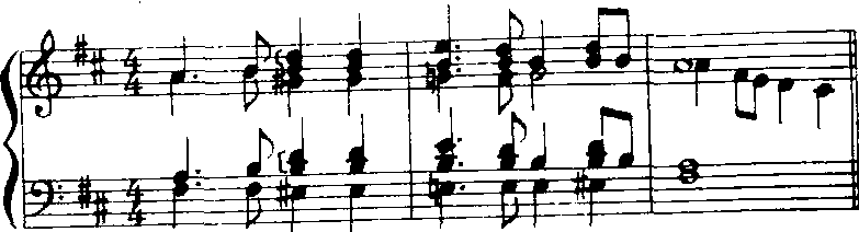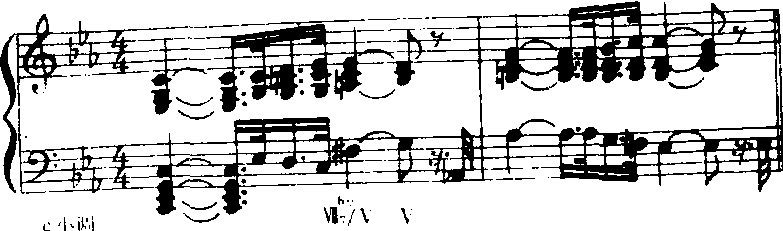 因此在为歌曲配置伴奏时,在情绪需要时适当选用Ⅶ7b7、Ⅶ7#1和弦,是会达到极好效果的。 |