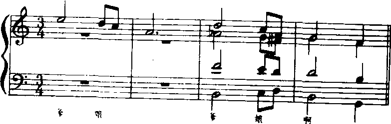 在“松花江上”一曲改编的合唱曲中,“爹娘啊”,也使用了减七和弦: