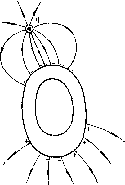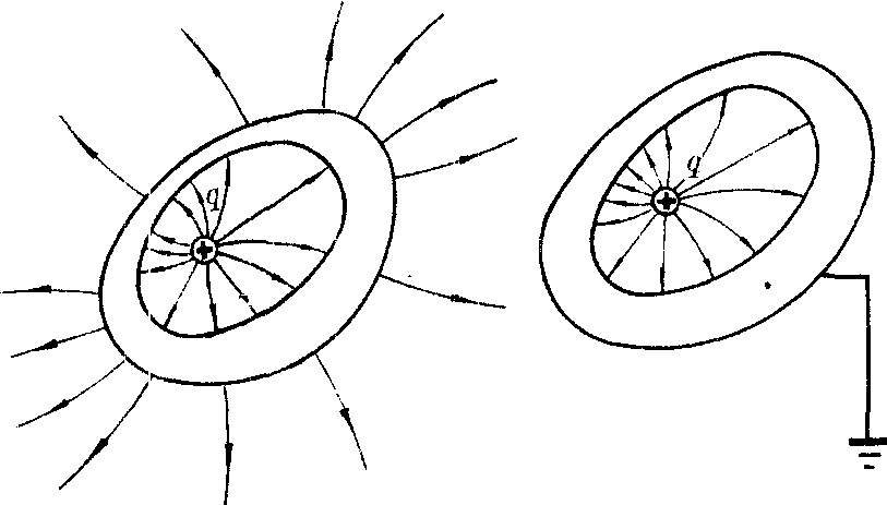 ❷整个壳内空间没有电场,或壳内处处E=0。这可归结为壳外电荷分布不影响壳内的电场,如图1所示;导体壳内存在带电体时,可以证明,导体壳内壁将感应出等值异号的电荷,壳外表面感应出等值同号的电荷。因此,壳内电荷将影响壳外的电场。导体壳接地,当壳外无其它电荷时,壳与地面构成等势体,因而壳外无电场,见图2。