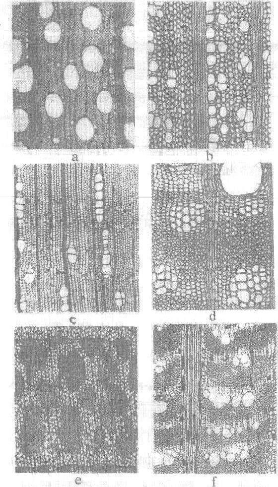 管孔组合排列图 管孔直径变化较大,特别是径向直径变化更大且不稳定,弦向直径较稳定,故一般测计均以弦向直径为准。 导管系统 是阔叶树材中的重要输导组织。一些单独的导管,常是沿着轴向路线前进的,有时亦可弦向分叉和在较小范围内径向分叉,因而在次生木质部中形成一个三度空间输导网络。水分可以从一个导管系统的纹孔和穿孔进入到其他几个导管系统。 导管分子细胞壁上的雕纹和纹孔式 以下介绍穿孔、穿孔板以及导管分子侧壁上纹孔的排列形式及螺纹加厚等。 穿孔和穿孔板 穿孔是指任意两个导管分子间的一个开孔或许多开孔。穿孔板,又称穿孔底壁,是指两个导管分子合生处除去开孔的胞壁部分而言。穿孔可分为单穿孔和复穿孔两大类。单穿孔,指穿孔板上具有一个大而略圆或椭圆形的开孔者。在穿孔周围所形成的边缘称作穿孔缘,它可出现在单穿孔及复穿孔中。单穿孔经常出现在榆科、楝科、桑科、壳斗科、槭树科、杨柳科、漆树科、豆科、橄榄科等木材中。复穿孔,是指一个导管分子的一个穿孔板上具有2个或2个以上的开孔。复穿孔又分为:❶梯状穿孔板。是指穿孔板上具有狭长而又平行的复穿孔者。穿孔之间残留的穿孔板部分称横闩或横隔。此种横闩是由复中层和2个次生壁形成。横闩的数目、类型(分枝或不分枝)对鉴别木材具一定价值,它常出现在木兰科等木材中。 ❷网状穿孔板。复穿孔为网状,出现在肉豆蔻科中的大叶勒麻木,杨梅科的杨梅,乌饭树科的米饭花,山茶科的油茶,金缕梅科的蚊母树、杨梅蚊母树、红苞木及紫葳科木材等。 ❸麻黄状穿孔板。指穿孔板上具有一小群圆形穿孔者,又称为多孔状穿孔板。常见于麻黄属、买麻藤属及Campsis radicans Seem.等木材中。有时有2个相邻接的端壁的穿孔不一定完全一致,有时可以出现一个胞壁大的穿孔与另一个胞壁的一群小的穿孔相吻合。 纹孔式 指导管分子侧壁上纹孔的排列形式。阔叶树材导管分子上的纹孔式各种各样。是识别木材的依据之一。导管分子胞壁上纹孔式可出现在径壁和弦壁上,依其与相邻接的细胞类型而异。❶管间纹孔式。广义的指管状分子之间的纹孔式;狭义的指导管与导管之间的纹孔式。管间纹孔式包括有互列的、对列的、梯状的及一些不规则形状等。 ❷射线—导管间纹孔式。指射线细胞与导管分子间的纹孔式,包括横向刻痕状、纵向刻痕状、肾状、大圆形及与管间纹孔式相似等,有时仍有单侧复纹孔式出现,即一个纹孔与相邻接细胞中的2个或2个以上较小的纹孔包含在其中,如木兰科等。 ❸筛状纹孔式。指许多小的纹孔排成筛状群团者,有时在一个初生纹孔场内,有几个纹孔发育。 ❹导管与薄壁细胞之间的纹孔对。可以是具缘的、半具缘的或单纹孔等。 管间纹孔的大小,亦可作为木材鉴别时的参考。 螺纹加厚 见螺纹加厚。 内含物 见细胞内含物。 导管vessel由一列端壁穿孔的细胞纵向相连而成的管状结构。组成导管的每一细胞称为导管分子。导管存在于绝大部分被子植物的木质部中,具有输导水分和无机盐类的功能。极少数原始类型的被子植物如水青树属、昆栏树属,以及八角茴香科无导管。有些水生植物、腐生植物(如水晶兰属)、寄生植物和肉质植物的导管,在演化中可能消失。少数蕨类植物如蕨属、卷柏属以及裸子植物的买麻藤纲有导管。