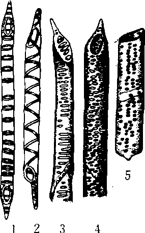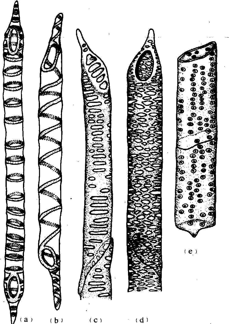 导管的主要纹式类型 1. 环纹导管 2. 螺纹导管 3. 梯纹导管 4. 网纹导管 5. 孔纹导管 |