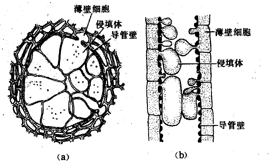 植物生长过程中,新导管陆续产生,有些较老的寻管逐渐丧失输导能力。通常由于导管周围的薄壁细胞体积增大,从导管的纹孔向导管腔内生长,形成囊状突起物,细胞质和细胞核移入其中,并积累单宁、树脂等物质,使导管腔被填满,这种堵塞导管的囊状突起物称为侵填体(图2)。侵填体的形成,增强了抗腐力,对防止病菌的侵害和提高木质部的耐水性有一定的作用。栎、洋槐、桑、葡萄等植物中常有大量侵填体形成。 导管被子植物木质部中主要输导水分和无机盐的管状构造。由一系列长管状的细胞,横壁溶解形成穿孔相连而成。成熟者已无原生质体,细胞壁有各式次生加厚且木质化,故也有一定的机械支持作用。 导管vessel木质部中输导水分和无机盐的管状结构。导管由一列端壁具穿孔的细胞——导管分子纵向相连而成,它们发源于原形成层或形成层。导管分子在发育初期为生活细胞,以后,细胞液泡化,内部物质逐渐消失,端壁穿孔解体。端壁有多个穿孔的为复穿孔板,只形成一个大穿孔的为单穿孔板。相应地,导管分子在侧壁上的一定部位发生次生加厚,沉积纤维素,形成环纹、螺纹、梯纹、网纹、孔纹等纹式类型。前两类导管多发生于幼嫩器官的原生木质部中,后3类导管常发生于后生木质部和次生木质部中。从演化上看,导管分子外形狭长,端壁斜尖,具复穿孔的较原始;外形宽短,端壁近于水平,具单穿孔的较进化。除极少数原始类型的被子植物(如水青树属、昆栏树属等)外,绝大部分被子植物的木质中都有导管,少数蕨类植物如蕨属、卷柏属以及裸子植物的买麻藤纲也有导管存在。