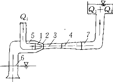 射流泵 1.喷嘴 2.喉管入口 3.喉管 4.扩散管 5.吸入室 6. 吸入管 7. 排出管 |