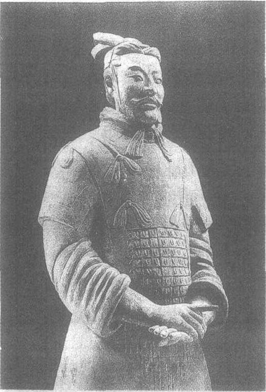| 释义 | 将军陶俑秦。高197厘米。陕西省临潼县秦始皇陵1号兵马俑坑出土。此俑戴燕尾长冠,身着长襦,前身系铠甲。他的脸形长方,浓眉大眼,唇上部有八字胡。凝视前方,面带微笑。右手握左手置腹前。其表情、目光、站姿都可看出他的沉着、干练,显然是身经百战,临阵而不乱,有很强的自信心,确具大将风度。看到他就使人想到了胜利,有着很强的艺术感染力。秦始皇兵马俑见“跪射武士陶俑”条目。