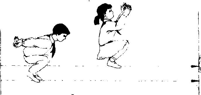 适用于1—3年级。可以发展学生协调, 灵敏素质。器材 扣子若干个, 线2—4根。场地 在室内空地画两条相距4—6米的平行线,一条为起点,另一条为终点。两线之间画2—4条竖线,每条线终点放一堆扣子, 线1根。游戏方法 把学生分成2—4队,各队成纵行站在起点线后。游戏开始,各队第一个同学迅速将双手掌立起,做小兔耳朵,两腿以半蹲姿势跳到终点。然后拿起线穿上5个扣子, 再放到原处, 用同样的方法跳回起点。按上述方法依次进行。最后一名同学将5个扣子穿完后,将线的两头系好成项链,套在自己脖子上跳回起点。最后先穿完“项链”第一个回到起点队为胜。