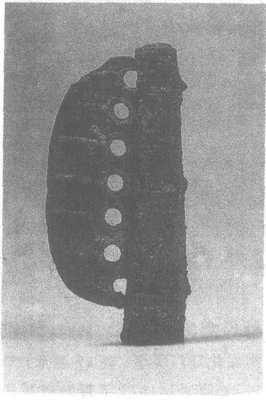 西周。兵器。长10厘米,宽8.8厘米。1983年青海省湟屯县卡约文化遗址出土。青海省文物考古队藏。此钺身呈半圆形,上铸一圆筒形銎,銎筒前粗后细。钺身有七个圆孔,每孔下面有一凸起的直道。銎部从口上至尾铸有三道长方孔,首尾两孔两长侧边均有一孔,用以插榫。
