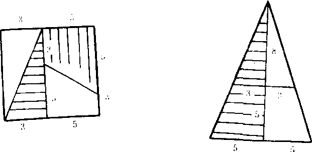 例3:把一个8×8的正方形按图示裁为四块,把这四块按图示拼成一个三角形, 这个三角形底边长为10, 高为13, 因此面积为65, 而正方形的面积为64,所以64=65。这一结论肯定不对,但其推理过程错在哪里。