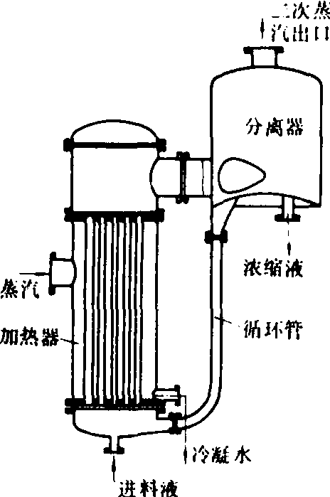 真空浓缩设备有盘管式,单效、多效升膜式和单效、多效降膜式。盘管式结构简单,操作维修容易,价格低,但盘管表面经常结垢,不能连续出料,消耗蒸汽和水量较大。单效升膜式由加热器、分离器和循环管组成(图1)。牛乳自加热器底部进入加热管,管间通入蒸汽,牛乳受热后迅速汽化,产生的二次蒸汽在管内高速上升,带动浓乳也沿管壁呈膜状上升,不断被加热蒸发而浓缩。浓缩乳以高速进入分离器进行汽液分离,二次蒸汽从分离器顶部排出,达到浓度要求的乳一部分从分离室底部放出,另一部分回到加热器底部与新进入的杀菌乳混合后继续加热浓缩。该设备占地面积小,传热效率高,受热时间仅10~20秒,但加热管较长,发生焦管后不易清洗。双效升膜式的工作原理与单效式相同,只是将其二次蒸汽引入另一单效加热器作为热源使用。因此,能节约加热蒸汽与冷却水。降膜式也有单、双效之分。牛乳由加热器顶部进入,靠自重沿管内壁成液膜状向下流动。牛乳从上部流到管底,基本能达到所需浓度,不必再进行循环。它的加热时间约2~3分钟,加热管要有足够长度,顶部应配有降膜分布器,使牛乳均匀流下。小型乳粉加工设备常采用单效升膜式或单效降膜式浓缩装置。