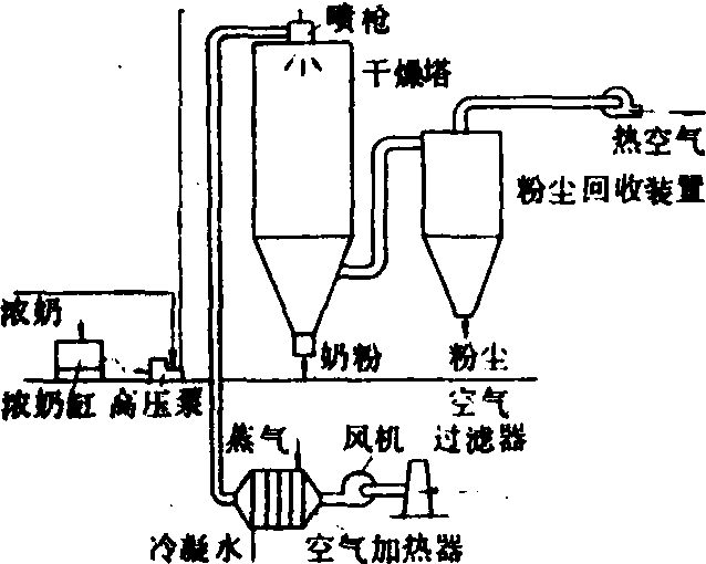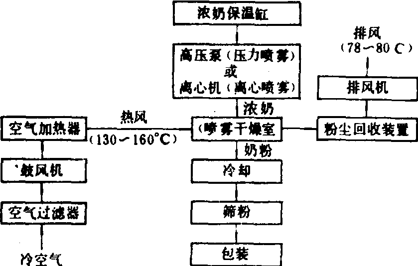 喷雾干燥 将浓乳喷成雾状后干燥成粉。喷雾干燥设备一般由空气过滤器、鼓风机、空气加热器、雾化器、干燥室、粉尘回收装置、排风机等组成(图2)。其工艺流程如图3所示。由鼓风机将冷空气经空气过滤器送入加热器,加热到130~160℃后进入喷雾干燥室。浓乳由高压泵(或离心机)送到雾化器,在压力(或离心力)作用下喷成10~200微米的雾滴,在干燥室内与热空气接触。表面水分蒸发,干燥成球形颗粒沉降到干燥室底部,经出粉口落入粉筒。水蒸汽被热风带走,从排风口排出。乳粉则送到筛粉间及时冷却后筛分包装。喷雾干燥常用压力式和离心式,两者的雾化器和雾化方法不同。压力式雾化器是喷枪,浓乳由高压泵(压力为9.8~14.7兆帕)压入喷枪,经喷嘴雾化后与加热空气混合进入干燥室干燥。离心式雾化器是离心盘,其圆周速度达200~800米/秒,浓乳通过离心盘的离心作用被雾化。压力喷雾结构简单,操作方便,但乳粉颗粒直径较小;离心喷雾产品颗粒大,冲调性能好,但结构复杂,运转费用高。小型乳粉加工设备多用压力式。喷雾干燥法干燥时间短、温度低、产品质量好、溶解度较高,便于自动化生产,但干燥设备比较庞大、热效率较低。