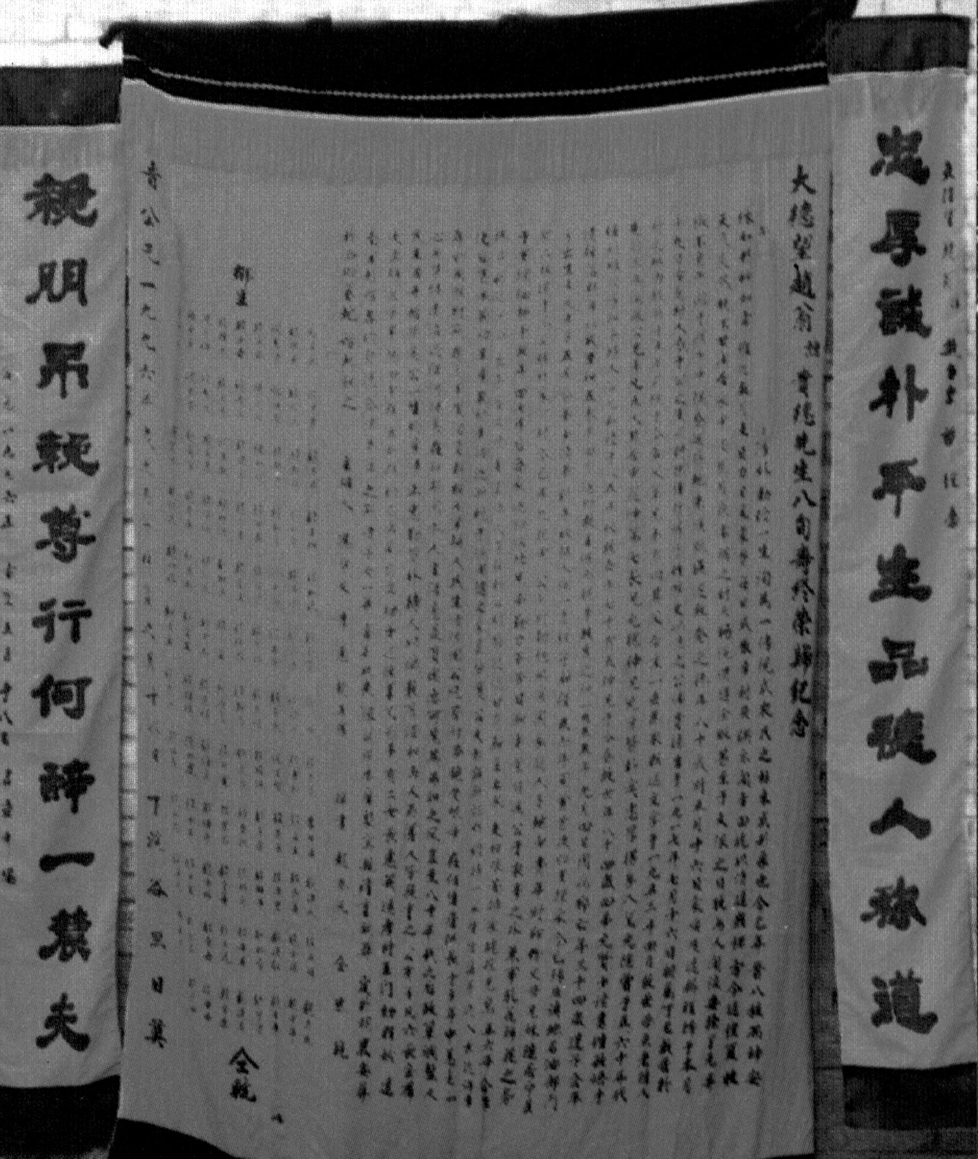 | 释义 | 小字挽幛xiɑozi wɑnzhɑnɡ民间丧葬习俗,流行于长武县相公、芋元乡一带。与其他地方举行丧葬仪式时所悬挂的大字写的挽幛不同,长武一带习用小字挽幛。小字挽幛须用上等绸缎和衬布精心剪裁,总长约2米多,宽1.5米左右,镶有双层黑色或白色圆边,嶂下垂有彩色丝绦。两侧有对条(对联)悬挂,其中两幅对条写道:“淡泊恬静晏如也福寿全归,勤学博识踔厉之德才兼备”;“忠厚诚朴平生品德人称道,亲朋吊挽尊行何辞一农夫”。幛文设上、下款,上款题“大德望”(男)、“大壸范”(女),下款题行情人名单并农历时序。对条概括事主一生功德,正文介绍其生平品德、事业和修养等方面成就,适当陈述本家族前三代及后代的正面事迹。这种小字挽嶂只限于乡邻敬挽,费用由敬挽者共同承担。逝世者祭奠之日,由乡邻用旗杆高高举起,在众孝子和唢呐乐队的迎接下,作为最贵重的礼品敬献于灵前,俗称悬幛或挂幛。逝者安葬后,幛子由子女妥为保存,世代相传。挽幛特点是无论谁家举办红白喜事,均可借来悬挂在设宴大棚的四周,少则有五六幅,多则有十几幅。来宾借此了解当地乡俗良莠,教诫子孙后代。此一习俗至今保存。