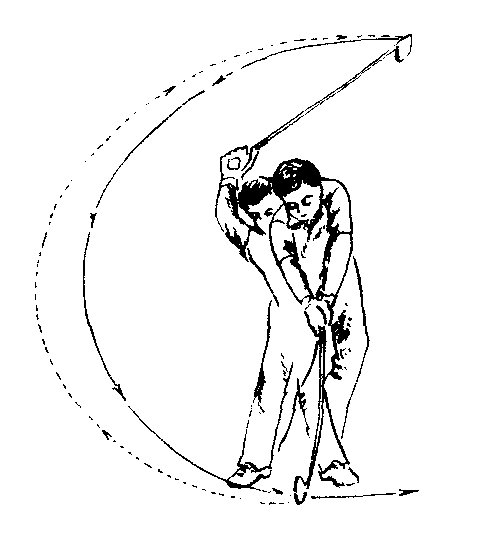 下挥注意事项:将上挥顶点构成的右侧姿势用力接合,与肩部平行。 肩部成45°时,杆头通过上挥轨道,再行下滑。