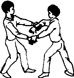 场地 室内外空地进行。 游戏方法 将学生按身材分成若干组,每组2人。预备时,2人面对面站立,各以左手抓住对方右腕,或以左手抓住对方右腕相持。游戏开始,双方互用已学过的技术,解脱被抓手腕,然后顺势拿住对方手腕。最后以一方两只手同时控制住对方为胜。然后胜者和胜者,败者和败者再按上述方法进行。 游戏规则 ❶一方两手拿住对方坚持5秒钟为胜。 ❷双方同时脱手,则重新开始。 |