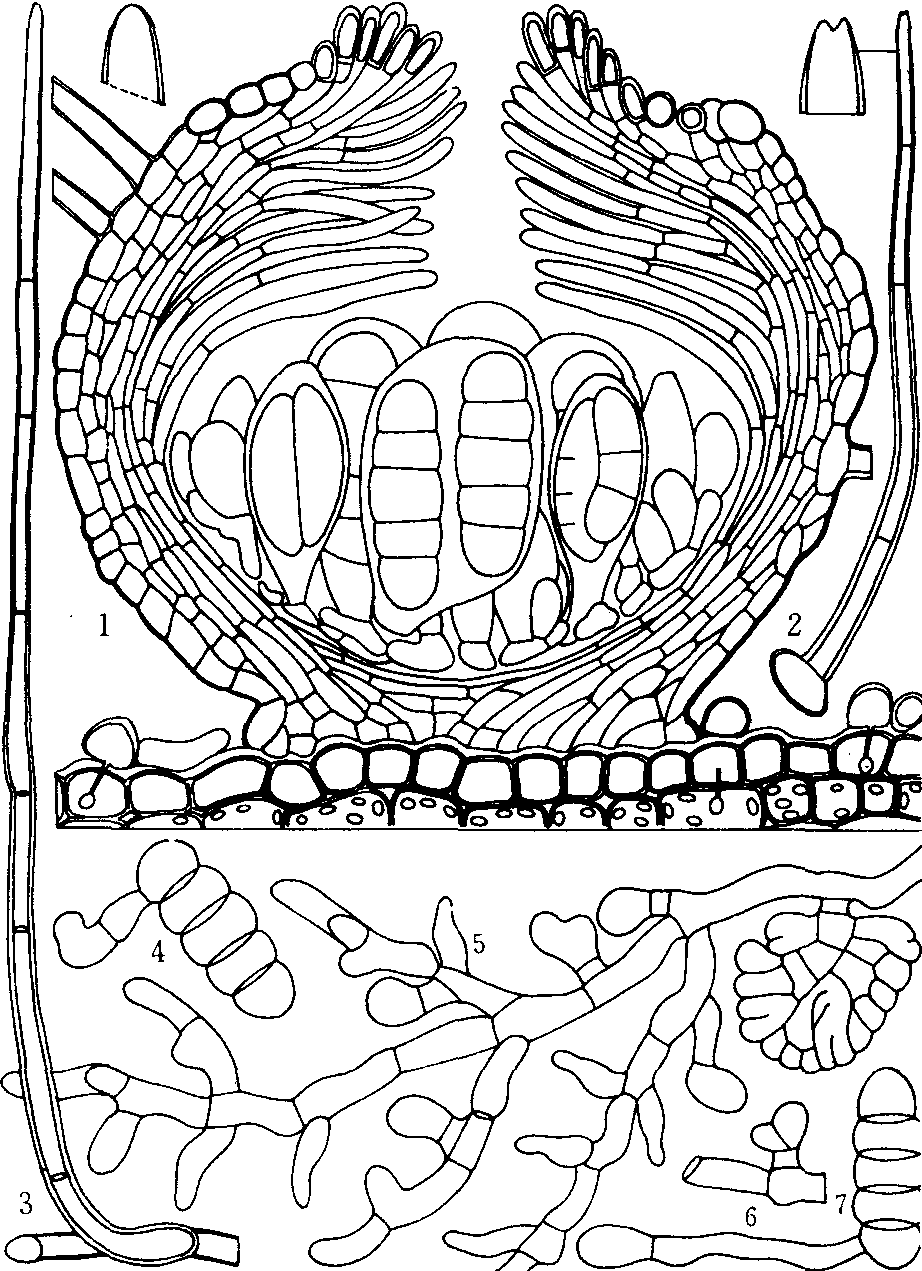 分类 多数学者认为小煤炱目只有一科,但科以下分属的意见不一致,最多的分为50多属。根据缪勒和阿克斯(Emil Muller和Josef Adloph vonArx,1973)的意见,分为7属。汉斯福德1961和1965年先后发表小煤炱属(Meliola)、小光壳炱属(Asteridiella)、针壳炱属(Irenopsis)、附丝壳属(Appendiculella)和双孢炱属(Diporotheca)分类专著。 小煤炱属(Meliola Fr.) 种类多,分布广,可引起多种植物病害。子囊壳裸生,子囊孢子多细胞,菌丝体刚毛散生或围绕子囊壳盘基着生(见图)。常见种有引起柑桔黑霉病的巴特勒小煤炱(M. butleri Syd.),引起龙眼黑霉病的好望角小煤炱龙眼变种[M.capen-sis (Kalchbr. et Cooke) Theiss. var. euphoriaeHansf.],引起杧果黑霉病的杧果小煤炱(M. mag-nifera Earle)以及寄生在甘蔗、竹等禾本科植物上的芦竹小煤炱(M. ardinis Pat.)和刚竹小小煤炱(M.phylles tachydis Yamam.)。 小煤炱目Meliolales子囊菌亚门,核菌纲。菌丝壁厚,暗褐色,有隔膜。菌丝体繁茂,外生,产生附着枝。附着枝常双胞,形状多样,顶端细胞膨大,紧贴寄主并产生吸器伸入寄主细胞内。有性生殖产生的闭囊壳扁球形或近球形,暗褐色,平滑或有小瘤,部分属在壳壁上生有刚毛。子囊卵圆形、椭圆形或圆筒形,多个束生,子囊壁单层、较薄。子囊孢子椭圆、长圆或圆筒形,2~5个,罕见8个,壁厚,平滑,暗褐色,2~5胞,多为5胞。无性态缺。陆生,专性寄生,主要分布在湿热的热带林区,危害多种植物叶片,呈烟雾症状。本目仅有小煤炱科,含小煤炱属、小光壳炱属和附丝壳属等40余属。 |