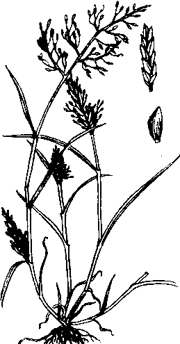 | 释义 | 小画眉草low lovegrassEra-grostis poaeoides Beauv.,又称蚊蚊草、星星草、香莠草。禾本科,画眉草属(知风草属)。一年生草本。疏丛型禾草。广布于世界温暖地带,中国遍布各地。茎直立或斜上,细弱,高10~30 cm。叶片扁平;叶鞘脉上具腺点,鞘口有长柔毛。圆锥花序,小穗含4至多数小花。颖果球形。多生长于荒野草地、田边、路旁和撩荒地。在荒漠草原与荒漠带草原上,常与三芒草等构成夏雨型一年生禾草层片。叶多柔嫩,适口性好,羊、牛、马均喜食;夏、秋季骆驼也乐食,而冬、春季一般不食。