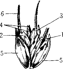 小麦的小穗 1.第一小花 2. 第二小花 3. 第三小花 4. 第四小花 5. 颖片 6. 芒 |